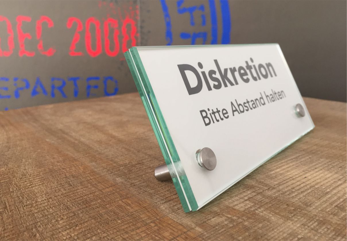Bei Glasschildern ist immer zu beachten, dass durch die brillante Oberfläche auch Spiegeleffekte entstehen welche durch die Umgebung beeinflusst sind wodurch der Kontrast und die Lesbarkeit leidet.