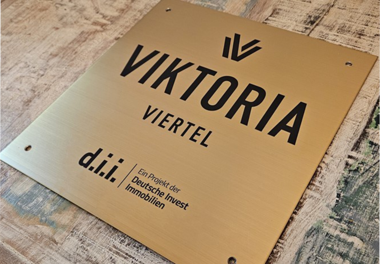 Aluminium in gold eloxiert ist eine Materialvariante die gerne als Messingschild tituliert wird. Goldene Aluminiumschilder sind die am häufigsten eingesetzten Metallschilder mit Goldton, man erkennt das sehr gut an den Schnittkanten der Tafel die silberfarben (Aluminium) sind. Der Vorteil von eloxierten Aluminiumschildern im Vergleich zu Messing ist neben den niedrigern Herstellungskosten die hervorragende Altersbeständigkeit, der Goldton ist durch eine Eloxalschicht aufgebracht. Eloxal ist eine elektrolytische Oxydation die als Schutzschicht ausgezeichnet funktioniert. Eloxierte Aluminiumschilder haben im Aussenbereich eine sehr große Lebensdauer, meist länger als der darauf verzeichnete Inhalt.