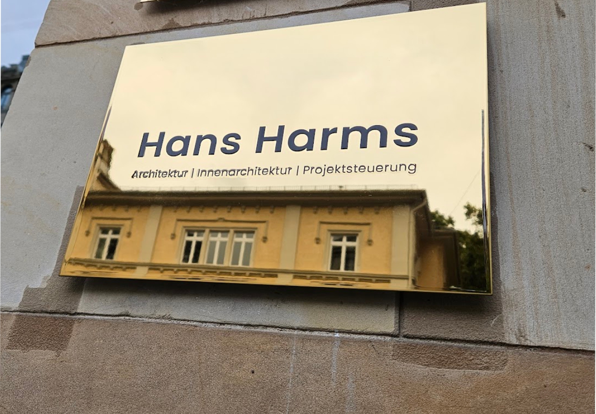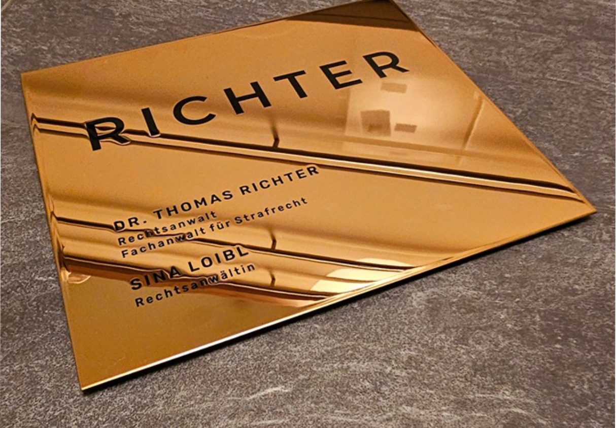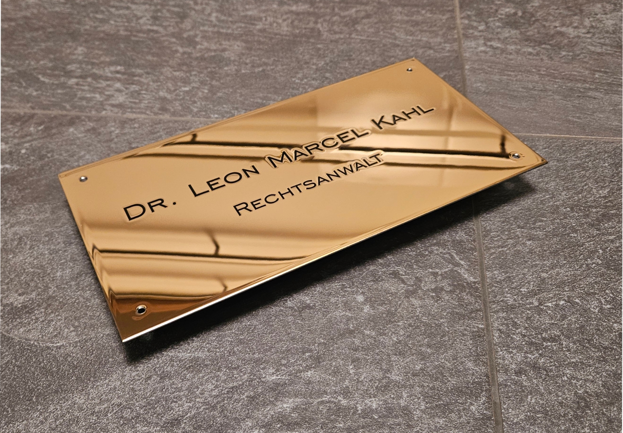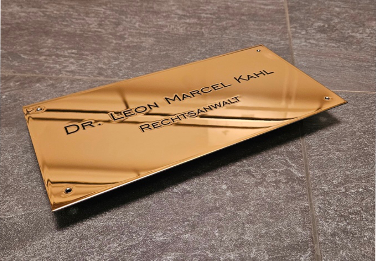 Edelstahl, spiegelpoliert und vergoldet hilft uns das Problem der sichtbaren Alterung von Messing zu verhindern. Wir sind glücklicherweise seit einigen Jahren in der Lage, große goldene und spiegelpolierte Schilder in sogenanntem "Diplomatenmessing" anbieten zu können und haben uns damit zum Marktführer entwickelt. Wir bieten, aufgrund der Materialvorteile fast ausschließlich "Messingschilder" in diesem Material an. Die Beschriftung erfolgt im Reliefdruck, der anschließend oberflächenbeschichtet wird. Hierbei entsteht ein leicht spürbares und sichtbares erhabenes Beschriftungsrelief, die Schriftfarbe bieten wir aufgrund technischer und klassischer Vorgaben fast ausschließlich in schwarz an.