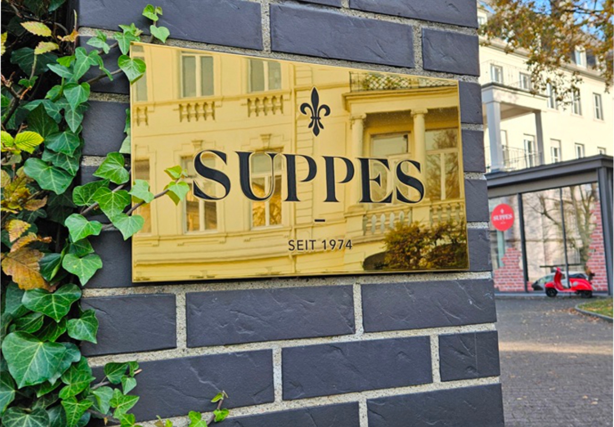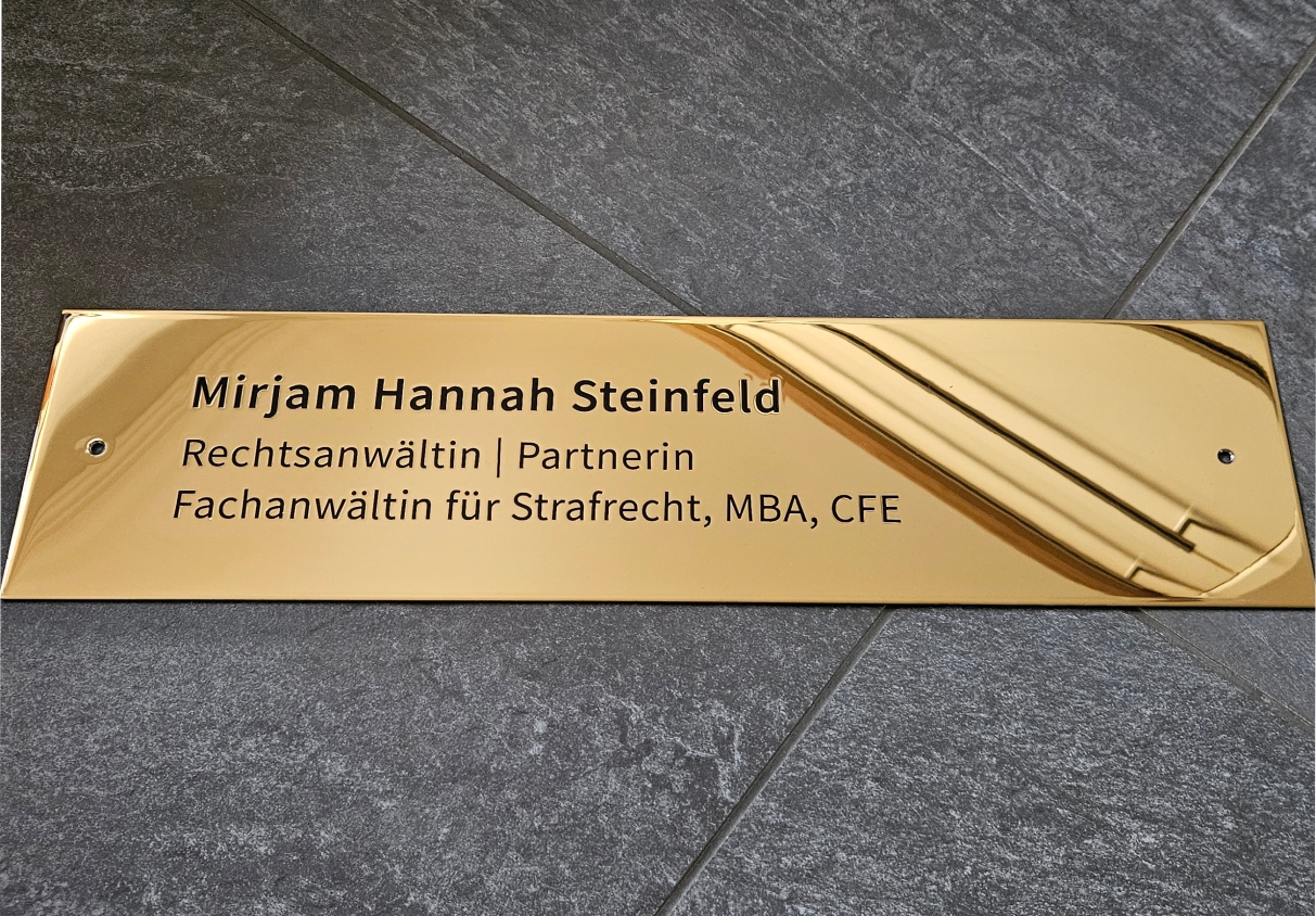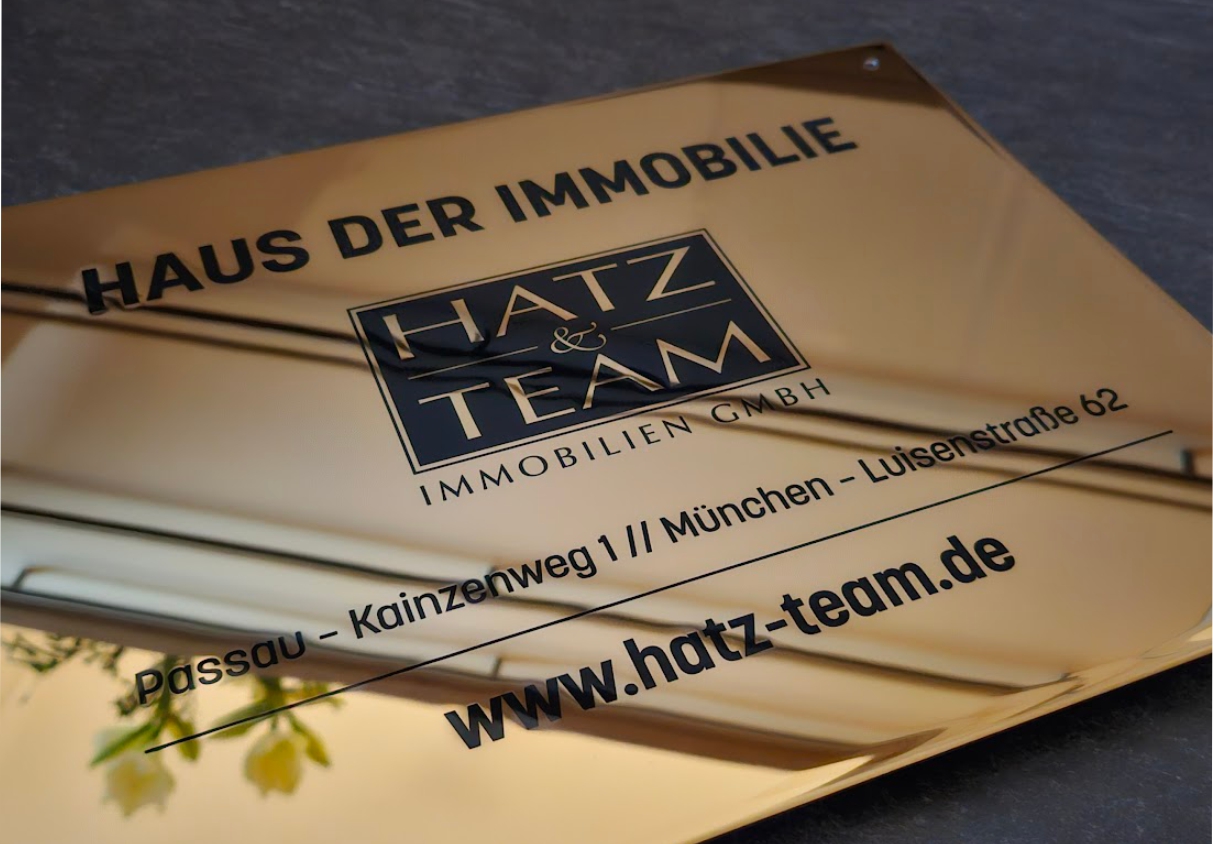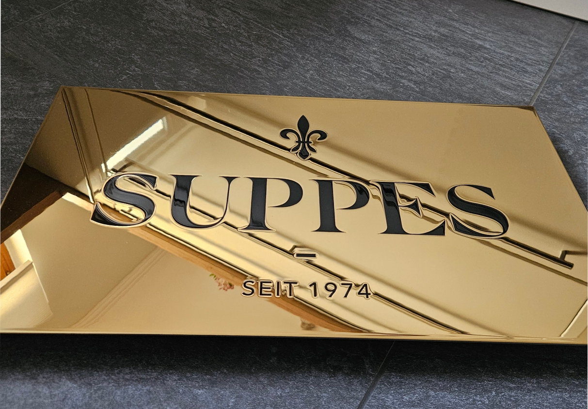 Edelstahl, spiegelpoliert und vergoldet hilft uns das Problem der sichtbaren Alterung von Messing zu verhindern. Wir sind glücklicherweise seit einigen Jahren in der Lage, große goldene und spiegelpolierte Schilder in sogenanntem "Diplomatenmessing" anbieten zu können und haben uns damit zum Marktführer entwickelt. Wir bieten, aufgrund der Materialvorteile fast ausschließlich "Messingschilder" in diesem Material an. Die Beschriftung erfolgt im Reliefdruck, der anschließend oberflächenbeschichtet wird. Hierbei entsteht ein leicht spürbares und sichtbares erhabenes Beschriftungsrelief, die Schriftfarbe bieten wir aufgrund technischer und klassischer Vorgaben fast ausschließlich in schwarz an.