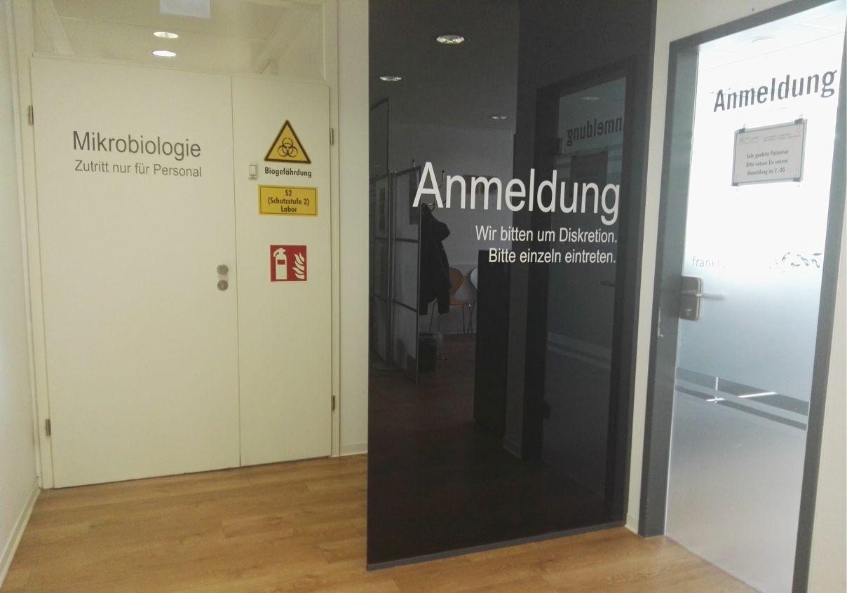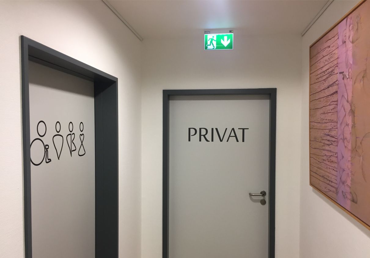 Am Praxiseingang wiederholt sich meist der Inhalt vom Aussenschild, mit Praxisbezeichnung, Namen und Titel der Ärzte, Öffnungszeiten und Kontakt. Meist sind jedoch nur Informationen zum Praxisnamen und die Namen der Ärzte notwendig.