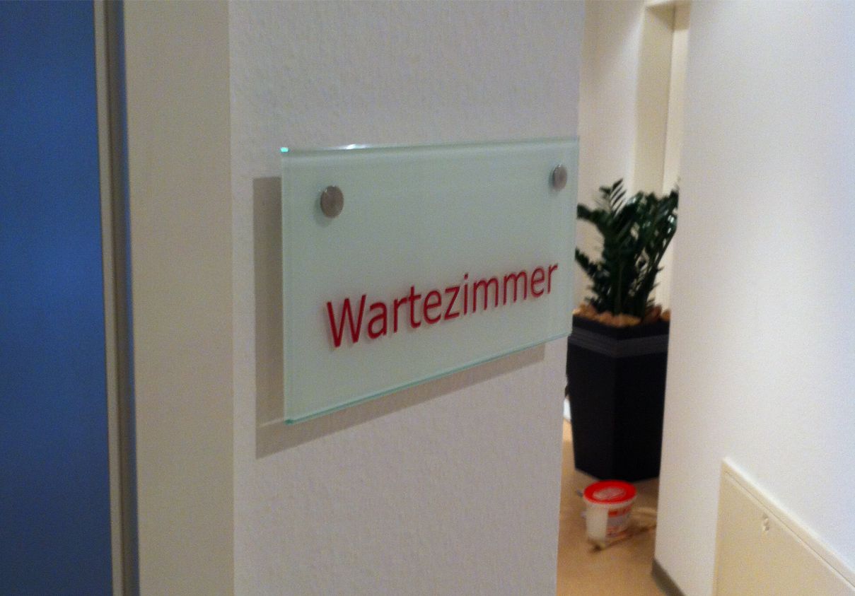 Mit der Türbeschriftung zieht Praxischarakter in die Räumlichkeiten ein, eine einfache Beschriftung mit Folienschrift (selbstklebende Einzelbuchstaben auch "Wandtattoo genannt") auf den Türblättern reicht oft schon aus. Das ist bei glatten Kunststofftüren oder Glastüren auch die günstigste Variante. Diese Art der Beschriftung kann jedoch auch an glatten Wänden neben der Tür oder als Wegweiser in der Praxis eingesetzt werden. Manchmal ist es sinnvoll, bei wechselnder Raumnutzung oder Raumbelegung die Türschilder so zu gestalten, dass der Beschriftungsträger intern geändert und ausgetauscht werden können. Hierfür gibt es unterschiedliche Träger mit einem Beschriftungsfeld in Glasoptik, die mit Einlegebögen meist in DIN Format DIN A6 - DIN A5 oder 15 x 15 cm belegt werden können. Das können Aluminiumrahmen sein, mit einer Abdeckscheibe in Acrylglas die nach vorne ausgewölbt oder aufzuschieben ist, diese sind von der Handhabung in der Praxis die einfachste Variante. Glasschilder in ESG Echtglas z.B. mit 2 übereinander gelegten Scheiben und zwischenliegenden Einlegebögen sind schwieriger zu tauschen, da diese oft mit einem Werkzeug umständlich demontiert- und montiert werden müssen.