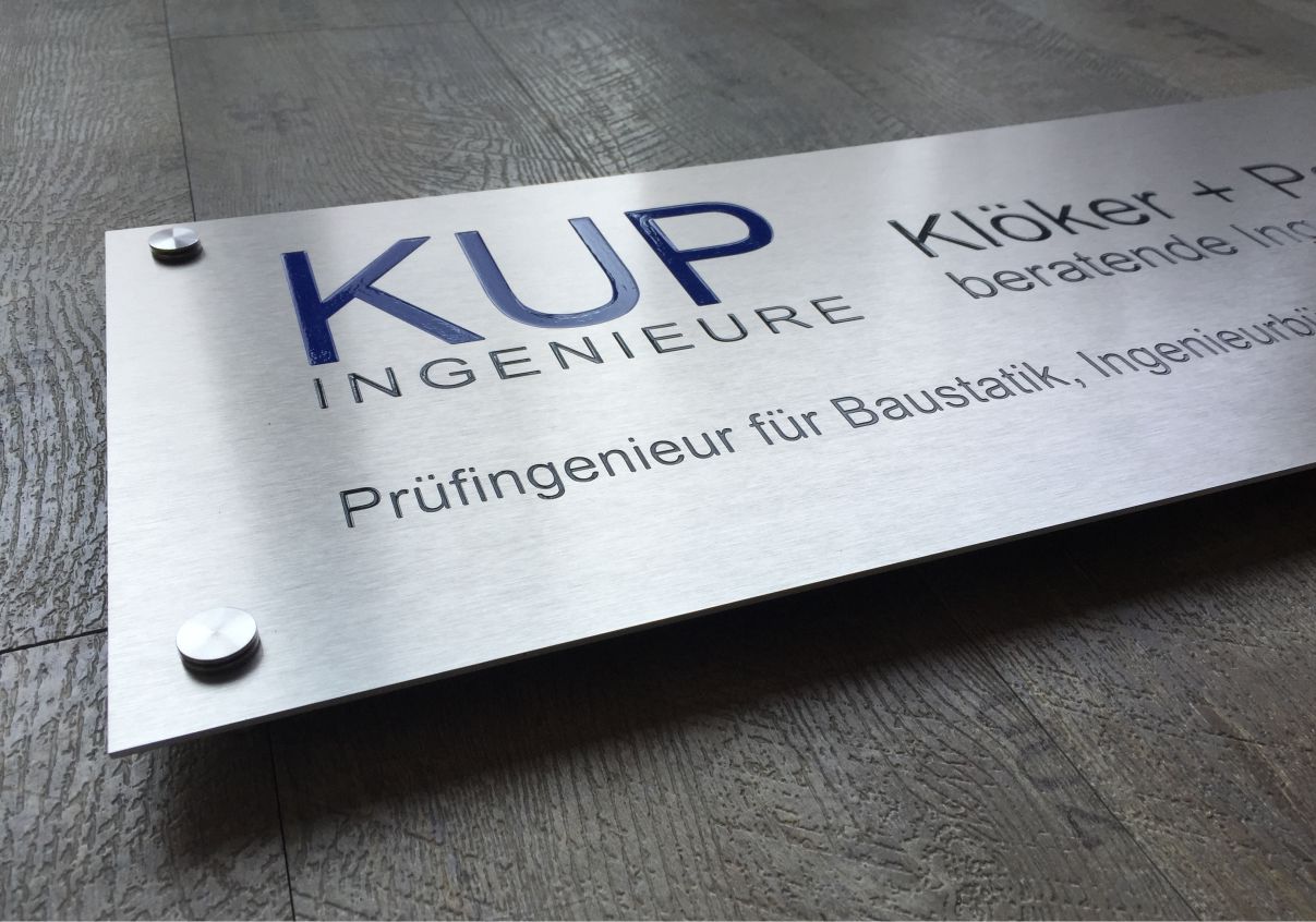 Aluminium in Edelstahloptik gravieren wir sehr viel, da sich dies von einem Laien im Vergleich zu V2A Edelstahl nicht unterscheiden lässt. Für unsere Zwecke sticht das Aluminium in Edelstahloptik im Vergleich zu V2A Edelstahl mit mehreren Vorteilen heraus. Vor allem lässt sich dies verhältnismäßig leicht spanend bearbeiten, was schon beim Zuschnitt zum Endformat beginnt und endet mit dem Vorteil dass es im Einsatz als Firmenschild im Aussenbereich keine Pflege bedarf. V2A Edelstahl ist da etwas komplizierter, da man sowohl Fingerabdrücke als auch Kalkrückstände von Regenwasser und ähnlicher Patinierung stärker erkennt, man bekommt das zwar durch die Pflege mit Maschinenöl und einem Tuch wieder gereinigt, dennoch ist es im Vergleich zu Aluminium mit Aufwand verbunden.
