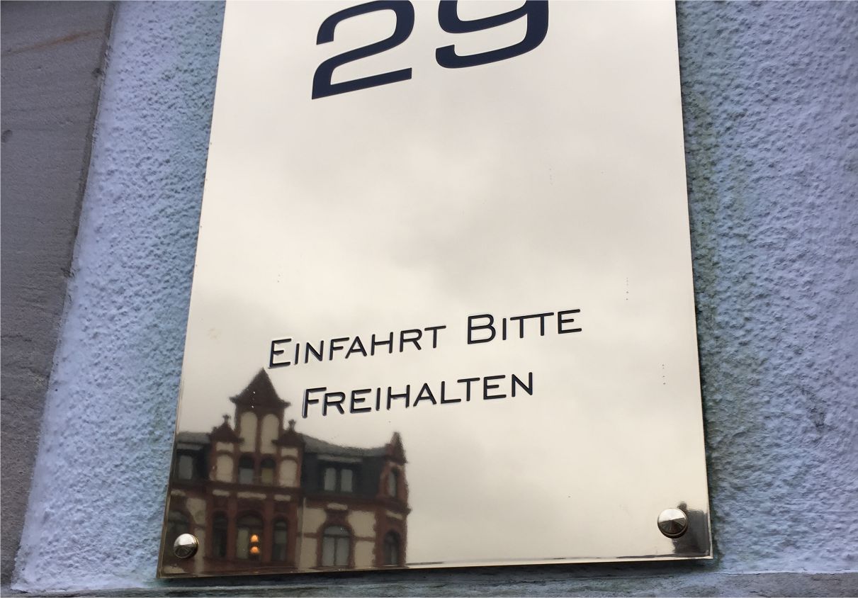Edelstahl, spiegelpoliert und vergoldet hilft uns das Problem der sichtbaren Alterung von Messing zu verhindern. Wir sind glücklicherweise seit einigen Jahren in der Lage, goldene und spiegelpolierte Schilder in sogenanntem "Diplomatenmessing" anbieten zu können. Wir bieten, aufgrund der Materialvorteile fast ausschließlich "Messingschilder" in diesem Material an. Die Beschriftung erfolgt im Reliefdruck, der anschließend oberflächenbeschichtet wird. Hierbei entsteht ein leicht spürbares und sichtbares erhabenes Beschriftungsrelief, die Schriftfarbe bieten wir aufgrund technischer und klassischer Vorgaben fast ausschließlich in schwarz an.