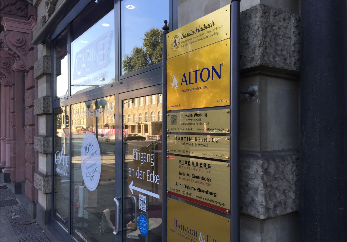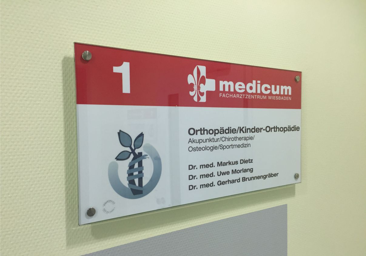 Am Praxiseingang wiederholt sich meist der Inhalt vom Aussenschild, mit Praxisbezeichnung, Namen und Titel der Ärzte, Öffnungszeiten und Kontakt. Meist sind jedoch nur Informationen zum Praxisnamen und die Namen der Ärzte notwendig.